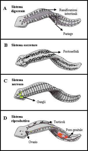 Per quanto riguarda il sistema escretore Fig. 1.1 B , le planarie sono dotate di protonefridi con tubuli di interconnessione, strutture che funzionano principalmente per l osmoregolazione, eliminando l'acqua in eccesso e, secondariamente, per eliminare alcuni prodotti di rifiuto.