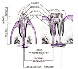 Nella radice del dente si trova la polpa dentaria, ricca di vasi sanguigni e terminazioni nervose, superiormente. vi è 1a dentina o avorio consistente in una varietà di tessuto osseo, il tutto è ricoperto da smalto.