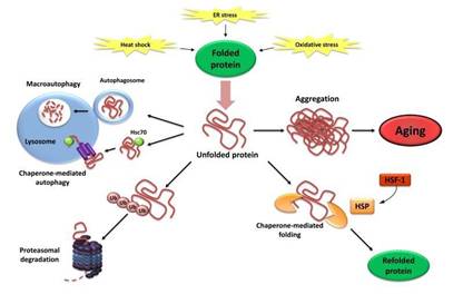 L'invecchiamento e alcune malattie ad esso associate sono collegate ad un'alterazione della proteostasi, cioè dei meccanismi che controllano la sintesi, la conformazione (il folding), la degradazione e l' aggregazione proteica (Powers et al., 009; Parenti G. et al., 20 2). Tra gli elementi coinvolti nella proteostasi si hanno proteine deputate a garantire la corretta conformazione, principalmente appartenenti alla famiglia delle