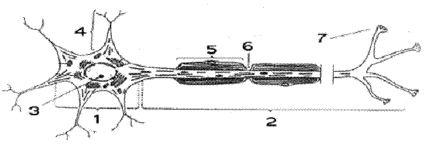 Esso si compone di due parti principale: il corpo cellulare (1), chiamato anche soma cellulare o pirenoforo, e le fibre che da esso partono, come l'assone (2), detto anche cilindrasse o neurite, e i dendriti (4).