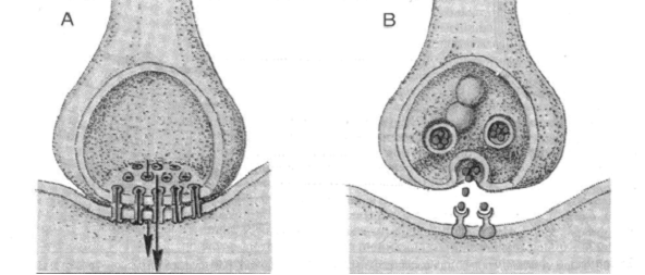 Esistono due tipi di sinapsi. La sinapsi elettrica (A) non ha nulla di affascinante in quanto, tramite il collegamento diretto fra sinapsi e cellula ricevente, la differenza di potenziale passa da una cellula all'altra portando avanti l'impulso elettrico. Questo tipo di sinapsi ha anche il difetto di non permettere alcun tipo di modulazione del segnale, che ha quindi solo la facoltà di proseguire senza essere amplificato o soppresso.