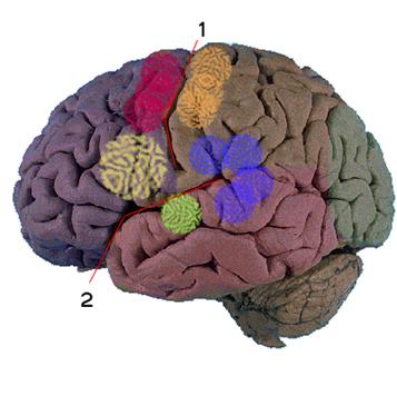 Si trovano zone sulla corteccia cerebrale destinate a svolgere particolari ruoli. Altamente specializzate nella gestione dei processi indispensabili alla vita dell'homo sapiens, queste zone prendono il nome di aree corticali. L'area di Broca (giallo), situata nel lobo frontale, è l'area motoria del linguaggio, cioè dove avvengono associati i movimenti dell'apparato fonatorio alle parole che deve esprimere. Le parole da esprimere vengono elaborati nell'area di Wernicke (verde chiaro), area sensoriale del linguaggio dove vengono associati i concetti alle adeguate parole che li possano esprimere. È necessario che queste due aree comunichino fra loro affinché l'individuo sia in grado di parlare in modo sensato e di leggere parole a cui conferire un significato. La comunicazione avviene tramite il Fascicolo Arcuato (blu), un fascio di fibre nervose che passa attorno alla scissura del Silvio che collega queste due aree. Ci sono altre due aree di notevole importanza, situate anteriormente e posteriormente alla scissura di Rolando; esse sono l'area motoria (rosso), nota anche come area prerolandica, e l'area somatosensoriale (arancione), detta anche area postrolandica.