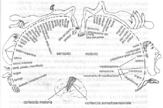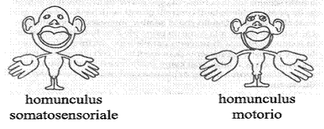 Se immaginiamo di avere un telencefalo fra le nostre mani e di aprire come un libro la scissura di Rolando, ci troveremmo davanti l'immagine sovrastante, con l'unica differenza che avremmo alla nostra sinistra l'area motoria e a destra quella sensoriale, come indica la miniatura di cervello nella parte inferiore dell'immagine. Quello che è interessante notare è che queste due aree non controllano a caso tutti i distretti del corpo, ma ogni piccola area ne ha una propria di pertinenza. Ciò che si è notato con lo studio della fisiologia di queste aree è che esse sono tanto più estese quanto più sono fini e sensibili le rispettive aree controllate. Facciamo un esempio: è chiaro che è più utile all'uomo saper fare movimenti precisi con le dita piuttosto che con l'avambraccio; guardando le aree che controllano i movimenti di queste due parti del corpo umano, notiamo che è più estesa quella destinata al controllo delle dita in confronto a quella che coordina i movimenti dell'avambraccio. Stessa cosa vale per l'area somatosensoriale; ci sono aree più vaste che corrispondono ai distretti del corpo umano più sensibili.