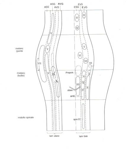 Per questo motivo i nuclei sono schematizzati lungo dei piani in senso medio-laterale e rostro-caudale detti colonne nucleari. Medialmente ci sono le colonne motrici e lateralmente le colonne sensitivo-sensoriali.