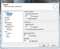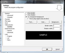 Tramite l'opzione Settings della barra dei men , è possibile scegliere la posizione del sottotitolo sullo schermo, il numero massimo di caratteri per riga, il tipo e il colore di questi ultimi e il minimo di frame che deve intercorrere tra un sottotitolo e l'altro.