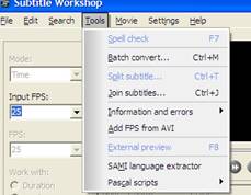 Selezionando invece l'opzione Tools, è possibile impostare il correttore ortografico (spell check) e utilizzare la funzione di unione o di divisione del sottotitolo (split/join subtitles), nel caso si volesse modificare lo spotting iniziale. Per concludere, una volta terminato il lavoro, si può ottenere una simulazione del risultato finale tramite la funzione external preview, selezionabile anch'essa dal menù Tools (Figura 9).