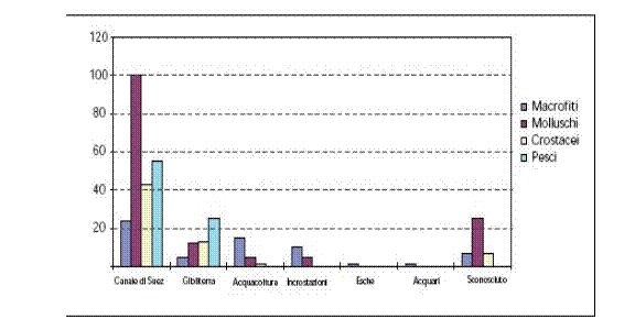 Ciò perché il canale di Suez dà la possibilità ai pesci tropicali di invadere il Mediterraneo, infatti nel 1902 è stato catturato il primo pesce colone. Da allora sono sempre più frequenti gli incontri con specie non originarie del Mediterraneo; questo fenomeno è stato denominato "migrazione lessespiana" dal nome della società che costruì il canale. Ormai sono numerose le nuove specie (circa 40 ) che hanno raggiunto una notevole importanza in termini di bio-massa (cioè la massa dei corpi che sono bio-degradabili), però l' aspetto maggiormente pericoloso è l'impatto che potrebbero avere queste specie sull' ecosistema mediterraneo.