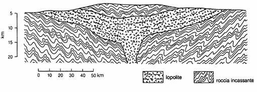 Figura 14. Sezione trasversale di un lopolite, un'ampia intrusione a forma di scodella, con un canale di alimentazione centrale. I lopoliti sono costituiti da rocce femiche, a volte sottoforma di intrusioni stratificate. I margini possono essere concordanti o discordanti