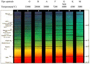 Esaminando le posizioni e gli spessori delle righe negli spettri possiamo determinare gli elementi o i composti chimici del corpo da cui proviene la luce, o delle masse gassose attraversate dalla luce stessa. Ma il «tipo spettrale» dipende dalla temperatura del corpo emittente e le stelle non hanno tutte la stessa temperatura, come rivelano i differenti colori con cui ci appaiono, strettamente legati alle temperature superficiali delle singole stelle. All'analisi spettroscopica, le diverse temperature delle stelle si traducono in differenti tipi spettrali: le stelle vengono perciò classificate in classi spettrali, ordinate in funzione di valori decrescenti della temperatura. La classe spettrale O, per esempio, comprende le stelle a più alta temperatura superficiale: 30 000-60 000 K(kelvin),di colore bianco-azzurro, mentre la classe M contiene quelle più «fredde» (30 000 kelvin), di colore rosso; il nostro Sole appartiene a una classe intermedia, con stelle di colore giallo e temperatura di 5 000-6 000 kelvin. Le analisi spettrali, effettuate su centinaia di migliaia di corpi celesti, mostrano una notevole uniformità nella composizione chimica delle atmosfere stellari (la parte più esterna dell'ammasso di materia di cui è formata una stella). Per la maggior parte tale materia è costituita di idrogeno (H:80%) e di elio (He:19%) mentre meno dell'1% comprende tutti gli altri elementi chimici che conosciamo.
