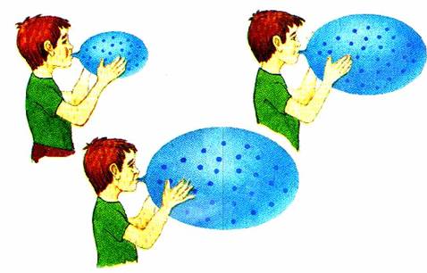 Per cercare di capire, almeno in parte, quello che succede, basta prendere un palloncino sgonfio e disegnarci sopra tanti pallini colorati. Soffiandoci dentro, la superficie del palloncino aumenta gradualmente e i pallini si allontanano gli uni dagli altri. Proprio come i punti disegnati sulla superficie del palloncino, le galassie sono immobili nello spazio: tutto il movimento è dato dall'espansione dello spazio, analoga a quella della superficie del palloncino. Così come i puntini del palloncino si allontanano gli uni dagli altri tanto più in fretta quanto più sono lontani, la velocità di fuga delle galassie aumenta in misura direttamente proporzionale alle loro distanze reciproche (legge di Hubble). Ma, al contrario di quanto potrebbe indurre a pensare l'analogia con il palloncino che si gonfia, lo spazio non si sta espandendo all'interno di qualcos'altro.