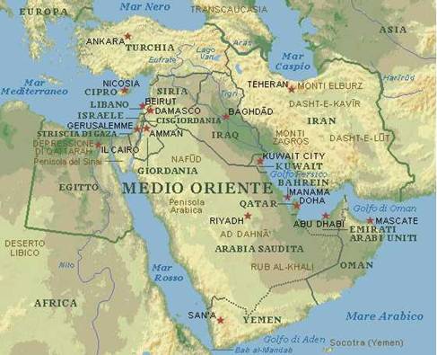 Il Medio Oriente è una vasta regione, con una superficie di oltre 7 milioni di kmq; è delimitata ad ovest dal Mar Mediterraneo e dal Mar Rosso, a sud dal Mare Arabico e dall'Oceano Indiano, ad est dalle montagne del Belucistan e dell'Hindukush, a nord dalla conca araliana, dal Mar Caspio, dalle montagne del Caucaso e dal mar Nero. La regione, che conta circa 200 milioni d'abitanti, comprende ben 19 stati: Turchia, Siria, Libano, Cipro, Israele, Giordania, Arabia Saudita, Yemen, Omar, Emirati Arabi Uniti, Qatar, Bahrein, Kuwait, Iraq, Georgia, Armenia, Azerbajdzan, Iran e Afghanistan.
