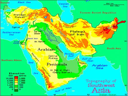tavolato, inclinato da sud-ovest verso nord-est e profondamente eroso dagli agenti esogeni, che in gran parte forma la penisola Arabica. Fra il tavolato Arabico e la fascia montuosa si distende la Mesopotamia, l'unica grande pianura dell'Asia Occidentale, percorsa da due fiumi il Tigri e l'Eufrate. Nella regione si trovano anche alcuni laghi salati, tra i quali il Mar Morto situato in Palestina, in una delle più profonde depressioni del pianeta.