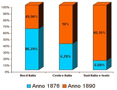 Nei primi anni del Regno emigrarono soprattutto gli abitanti delle regioni settentrionali, socialmente più progredite e con popolazione più numerosa. Nelle regioni meridionali il fenomeno fu per lungo tempo irrilevante a causa del loro isolamento, della scarsa viabilità e dell'ignoranza, ma anche del loro attaccamento alla terra e alla casa. In breve tempo il rapporto si invertì per due cause: 1- intenso ritmo di accrescimento demografico; 2- condizioni economiche misere. Infatti il valore degli emigrati settentrionali diminuì dall'87% al 50% mentre crebbe quello degli emigrati dell'Italia meridionale, insulare e centrale dal 7% con un massimo di 40%.