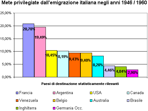L'emigrazione italiana del XX secolo si rivolge sia verso l'Europa, particolarmente in Francia, sia verso Paesi Extra-Europei, quali Argentina, USA. Dall'esame dei dati relativi al periodo che va dal 1946 al 1960, si può constatare che l'emigrazione permanente ha registrato 2.618.068 espatri di cui 1.628.170 verso i Paesi transoceanici e 989.898 verso i Paesi europei.