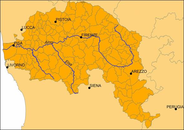 Il bacino del fiume Arno, come definito per gli effetti della legge 183 89, comprende, oltre al bacino idrografico in senso stretto, anche la zona compresa tra lo Scolmatore ed il Fiume Morto, inclusa l area di bonifica di Coltano-Stagno ed il bacino del torrente Tora. Il territorio del bacino interessa la Regione Toscana 98,4 ) e la Regione Umbria 1,6 ) con le province di Arezzo, Firenze, Pistoia, Prato, Pisa e, marginalmente, Siena, Lucca, Livorno e Perugia (http www.arno autoritadibacino.it/