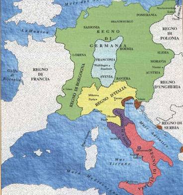 il regno Germanico (area verde e celeste) che, essendo uno Stato feudale, era suddiviso, a sua volta in una serie di grandi feudi (Regno di Borgogna e Ducati di Lorena, Sassonia, Slesia, Moravia, Pomerania, Svevia, Franconia, Baviera, Austria, Boemia).