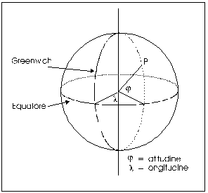 Come in un sistema di assi cartesiani possiamo individuare in modo univoco un punto sul piano attraverso due numeri detti coordinate che esprimono la distanza del punto (misurata perpendicolarmente agli assi) dagli assi x ed y di riferimento, così sulla superficie terrestre possiamo calcolare la posizione di un punto tramite le sue coordinate geografiche, la sua distanza cioè dagli assi geografici di riferimento (equatore e meridiano di Greenwich). Le coordinate geografiche prendono il nome di latitudine e longitudine. Trovandoci su di una superficie sferica, latitudine e longitudine non si misurano in unità di misura di lunghezza (m km etc), ma attraverso unità di misura di ampiezza, cioè in gradi e sottomultipli (1° = 60' ; 1' = 60'') Così la latitudine (j) di un punto P è la distanza angolare del punto dall'equatore misurata lungo l'arco del meridiano passante per P (cioè misurata perpendicolarmente all'equatore). In altre parole è l'angolo sotto il quale viene visto dal centro della terra l'arco di meridiano che congiunge P all'equatore. La longitudine (l) del punto P è invece la distanza angolare del punto P dal meridiano di Greenwich, misurata lungo l'arco di parallelo che passa per P (cioè misurata perpendicolarmente al meridiano di Greenwich. In altre parole è l'angolo sotto il quale viene visto dal centro della terra l'arco di equatore che congiunge il meridiano di Greenwich al meridiano passante per P. Normalmente sulla superficie terrestre vengono segnati solo i paralleli ed i meridiani di grado, cioè quelli che distano un grado l'uno dall'altro(meridiani e paralleli sono però infiniti).