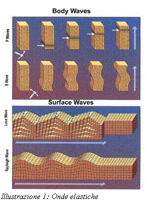 Nel primo gruppo possiamo individuare le onde longitudinali (o di compressione) e le onde trasversali (o di taglio). Le prime sono quelle al cui passaggio le particelle oscillano avanti ed indietro nella direzione di propagazione dell'onda stessa (la roccia subisce rapide variazioni di volume); le seconde invece sono quelle al cui passaggio le particelle di roccia compiono delle oscillazioni perpendicolari alla direzione di propagazione.