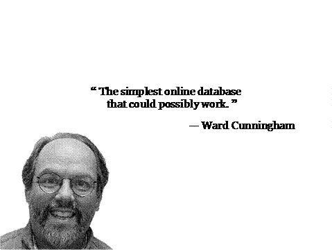 Ward Cunningham nel 1995 ha avuto l'idea e ha realizzato il programma per gestire il primo sito Wiki intitolato "Portland Pattern Repository's Wiki" : una comunità di pratica fatta di persone, progetti e idee sulle metodologie di progettazione e sviluppo di software. Dopo 10 anni il sito è ancora attivo e vi contribuiscono i più importanti ricercatori ed autori di libri esperti di Design Patter e dell'eXtreme Programming.