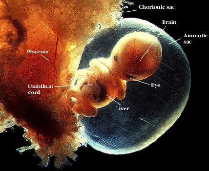 - 8^ SETTIMANA GESTAZIONALE: midollo e tronco encefalico sono delineati, la lunghezza del feto è poco più di 30mm., le braccia si piegano in corrispondenza del gomito. le gambe si sono allungate e si vedono le dita delle mani.