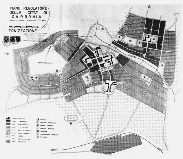 The last months of 1936, the Italian Coal Firm (A.Ca.I.), with the system of the drilling, located the Sirai-Serbariu field that revealed itself to be immense. The expectation of an intense activity in the new pits and the consequent arrive of labour suggested the project of new working town near the mines and the port of Sant'Antioco in order to secure the transport of the extracted materials.