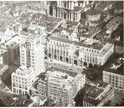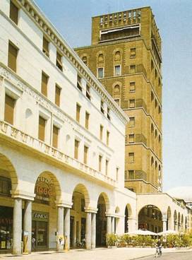 L'emblema iconografico della piazza, l'elemento più significativo del progetto presente sino nei primi schizzi progettuali del Piacentini, è costituito dal torrione Ina o "edificio multipiano", come preferiva battezzarlo l'attento lessico autarchico delle gerarchie del regime.