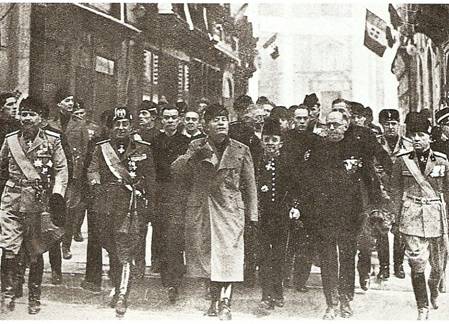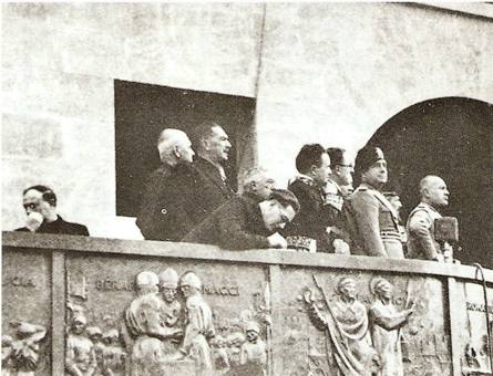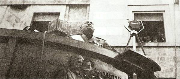 "DAVANTI AGLI EDIFICI SUPERBI DI QUESTA PIAZZA CHE VOI AVETE DEDICATO ALLA VITTORIA E AGLI IMMORTALI SPIRITI CHE LA CONQUISTARONO, DAVANTI A QUESTA PIAZZA MONUMENTALE E AGLI ALTRI EDIFICI, LE PAROLE SONO SUPERFLUE, PERCHÉ PARLANO LE PAROLE, PARLANO I FATTI. QUELLO CHE VI È PIÙ CONFORTANTE IN QUESTO PERIODO E CHE RIVELA LA SPLENDIDA MATURITÀ DEL POPOLO ITALIANO, È CHE SI PUÒ PARLARE FRANCAMENTE ALLE MOLTITUDINI, DIRE AD ESSE CHE LA VIA NON È FACILE, AMMONIRLE CHE SARANNO NECESSARI ALTRI SACRIFICI, PERCHÉ SENZA SACRIFICI NON SI FA LA STORIA".