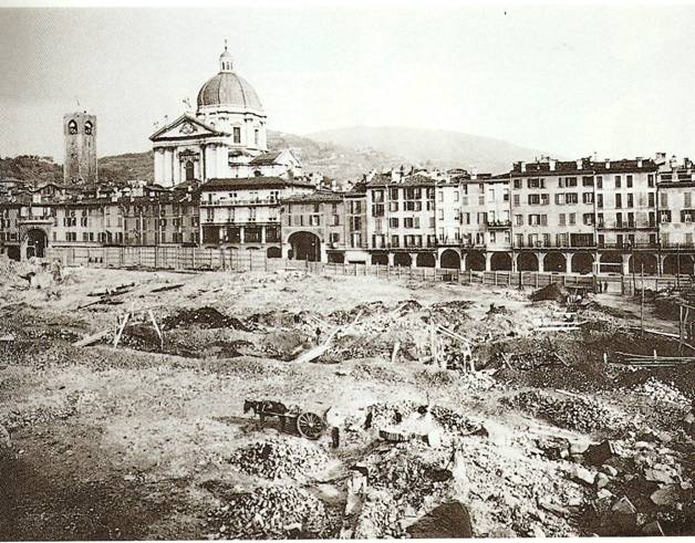 Nessuna piazza di Brescia ha perduto, in cinquant'anni, così estesamente e brutalmente gran parte degli elementi decorativi, d'arredo, di arricchimento plastico e pittorico che la connotavano prima della seconda guerra mondiale.