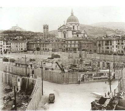 Il colpo decisivo alla piazza venne sfoderato dalla realizzazione dell'autosilo, progettato dall'architetto Fedrigolli negli anni sessanta. Il grande squarcio della presa d'aria, proprio sull'asse prospettico principale, l'accesso carraio sul lato occidentale e le varie forature del marciapiede e delle gradinature in porfido di Bienno hanno alterato la percezione spaziale dell'invaso della piazza, quella che opportunamente si è definita la sua ispirazione "metafisica", forse l'aspetto più originale di tutta l'operazione.