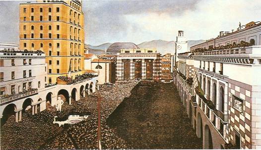 Inserito di peso nel cuore del centro cittadino, il mastodontico complesso di edifici che costituiscono la piazza ne ha modificato in maniera sostanziale la fisionomia e il senso, ponendosi, con linearità dei suoi volumi, con la levigatezza delle sue superfici, con l'inquietante vastità dei suoi spazi, in una totale alterità rispetto all'aspetto labirintico, "casuale", "caldo" dei quartieri di impianto medievale. Un'alterità trasformatasi ben presto in estraneità alla vita e alle abitudini della città, scontata con una frequentazione tanto scarsa da rasentare la diserzione e risolversi in un sostanziale abbandono.
