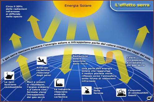 II vapore acqueo,l'anidride carbonica, il metano e l'ozono sono gas che ostacolano la cessione al cosmo della radiazione ad onde lunghe e quindi del calore accumulato dal pianeta. Per tale ragione la temperatura media terrestre è in continuo aumento.