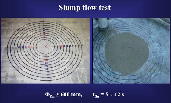 se al bordo della pizza c'è un effetto di bleeding non si tratta di un cls autocompattante, inoltre se essa assume la forma di un sombrero non va bene perché vuol dire che c'è stato effetto di segregazione.