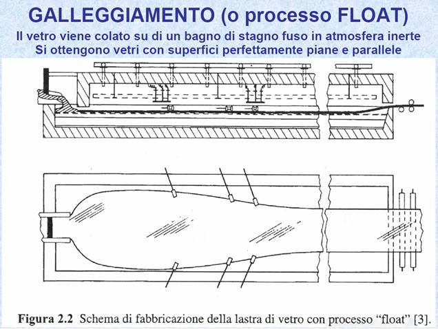 a. Galleggiamento: per i vetri degli infissi, serve per produrre vetri con un determinato spessore, si crea prima uno strato di stagno fuso su cui si versa il vetro fuso, dato che i due materiali hanno differenti masse volumiche la separazione è netta, lo stagno sta sotto e il vetro rimane sopra, e la superficie che ne viene fuori è netta, perfettamente liscia. La produzione è continua e dalla macchina esce un vetro unico che poi verrà tagliato.