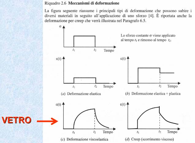 In realtà il vetro non è proprio elastico ma visco-elastico, cioè se applico un carico, oltre la deformazione elastica ci sarà anche una deformazione viscosa. Una volta tolto il carico, la deformazione elastica viene subito recuperata mentre quella viscosa viene recuperata dopo un pò di tempo, più o meno è lo stesso comportamento del legno., dove in realtà le deformazioni viscose alle volte sono permanenti.