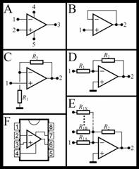 In generale il modello dell'amplificatore presenta due ingressi: uno definito invertente, indicato con il simbolo '-', l'altro definito non invertente, indicato con il simbolo '+', ed una uscita (figura A in alto a destra).