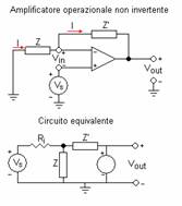 invertente:Un amplificatore non invertente con operazionali si ottiene applicando la tensione d'ingresso Vs sul morsetto contraddistinto dal segno + (non invertente). Nell'amplificatore di tensione non invertente la fase del segnale uscente corrisponde a quella del segnale entrante. Il guadagno, o amplificazione, dell'amplificatore è il rapporto tra la tensione di uscita e la tensione di ingresso. Se applichiamo la legge di Kirchhoff delle correnti al nodo del circuito equivalente e usando la legge di ohm: