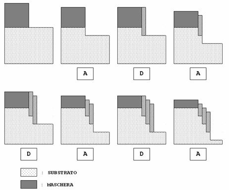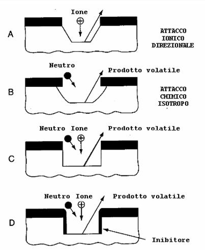 In Fig. 2 sono mostrati diversi possibili profili di scavo: a seconda del tipo di attacco impiegato, si possono ottenere profili verticali, direzionali, o isotropi. Con gli attacchi dry si possono produrre scavi anisotropi (verticali o direzionali) in materiali cristallini, policristallini ed amorfi: l'anisotropia è infatti controllata dalla caratteristiche del plasma.
