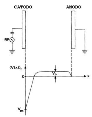 Se si applica un potenziale a radio frequenza ad un elettrodo attraverso una rete per l'adattamento dell'impedenza, nei i cicli positivi e negativi il plasma si comporta diversamente.