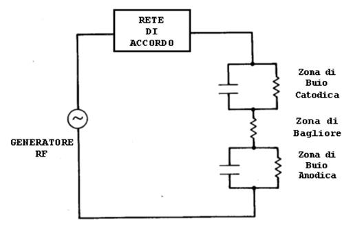 Un circuito equivalente per un plasma RF, che non tenga conto del suo comportamento rettificante, è mostrato in Fig. 1.