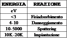 fisiadsorbimento; tra 4 e 10eV danneggiamento della superficie; sopra i 10eV si