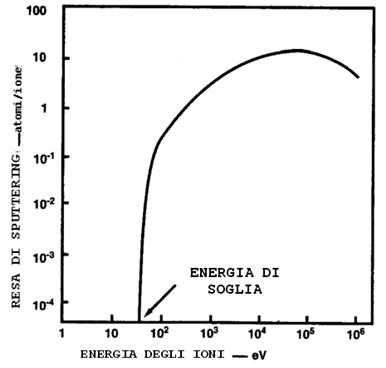 In Fig. 1 è mostrato l'andamento tipico della resa di sputtering in funzione dell'energia dello ione incidente. S aumenta con tale energia fino a raggiungere un massimo per energie che vanno da 5 a 50KeV: sopra i 50KeV decresce a causa della maggiore penetrazione degli ioni nel substrato (impiantazione ionica).