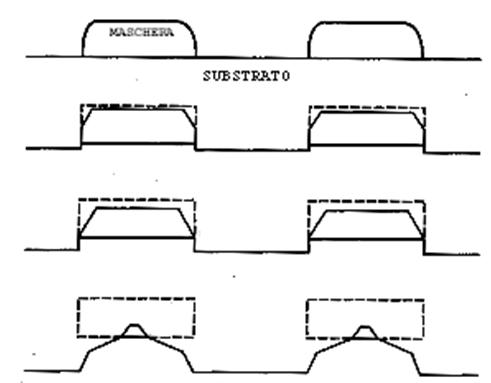 Anche se si parte da una maschera a pareti verticali, l'attacco ionico tende a sviluppare una sfaccettatura nel bordo della maschera tale che l'angolo da essa formato con la direzione degli ioni incidenti sia quello per cui la resa di sputtering del materiale della maschera sia massima (Fig. 2 del par II.1).
