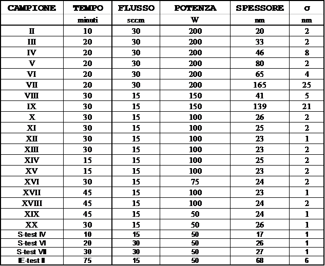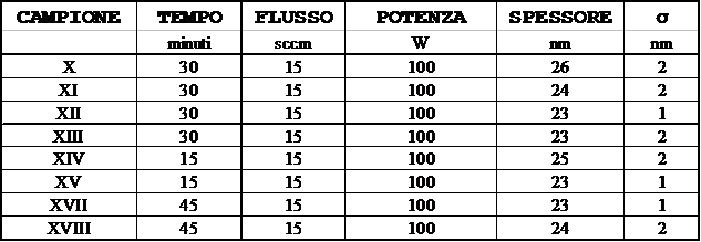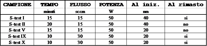 potenza 100W e flusso 15sccm (Tab. VI) hanno portato alla completa rimozione