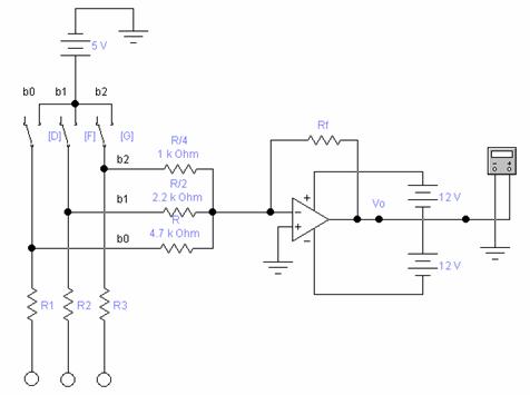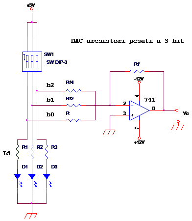 Osservando lo schema elettrico, possiamo notare che è un convertitore D/A a resistori pesati a 3 bit, e i tre resistori d'ingresso hanno valori che aumentano con la potenza del 2, infatti valgono R, R/2, R/4 e per questo motivo vengono detti pesati