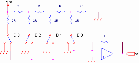 Vengono utilizzati solamente due valori per i resistori, R e 2R. Questo convertitore a quattro bit presenta quattro interruttori comandati dagli ingressi digitali. L'operazionale invertente finale ha solamente il compito di convertire la corrente proveniente dal circuito in una tensione. Cambiando lo stato degli interruttori varia solo la corrente che giunge all'ingresso invertente dell'operazionale (la corrente Vref resta uguale).