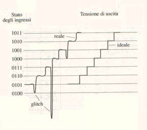 Un altra caratteristica dei dac è che in corrispondenza di certe commutazioni possono verificarsi degli impulsi indesiderati di breve durata ma di ampiezza considerevole chiamati glitch. Ad esempio nel passaggio tra la combinazione binaria 0111 a quella 1000, in quanto il tempo di commutazione alto-basso è diverso da quello basso-alto (più piccolo) si avrà per un istante la combinazione in uscita 0000, che tradotta diventa un impulso che da metà della tensione di riferimento va a zero, come in figura.