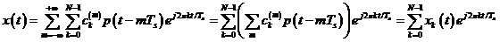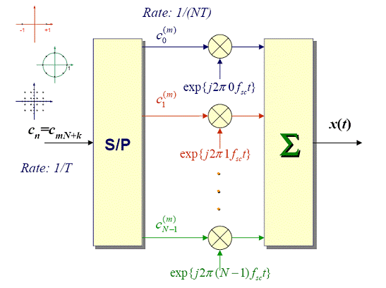 Volendo adesso ricavare l'occupazione spettrale di questo segnale, iniziamo con l'osservare che questo è costituito dalla somma di N segnali dati statisticamente indipendenti ciascuno modulato su di una sottoportante diversa. Riscriviamo dunque x ( t ) come somma di questi contributi: