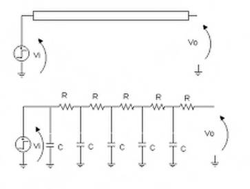 E' importante valutare questo ritardo intrinseco essenzialmente per stabilire se esso (come si spera) è sufficientemente piccolo in modo da poterlo trascurare. Tale ritardo intrinseco è dovuto al fatto che ogni pezzettino della linea d'interconessione, che è da considerarsi come una linea a parametri distribuiti, ha una resistenza ed una capacità; quindi, ognuno di questi pezzettini introduce un elemento di ritardo. Per studiare questo circuito, dividiamo la nostra linea in tanti pezzettini, ognuno dei quali è approssimato con una resistenza R ed una capacità C verso massa. Supponendo che tali pezzettini abbiano tutti le stesse dimensioni, associamo loro uno stesso valore di R e di C. Il sistema che ne risulta è di tipo passa-basso, quindi possiamo approssimare la risposta del nostro sistema mediante un sistema equivalente del primo ordine, utilizzando la tecnica delle costanti di tempo.