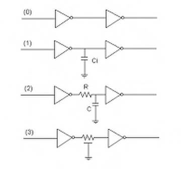 Considerando due invertitori in cascata, al livello di approssimazione (1) consideriamo la sola capacità introdotta dall'interconnessione Ci. Al livello di approssimazione (2) possiamo tenere in conto anche della resistenza serie R dell'interconnessione. Al livello (3) sono considerati anche gli aspetti distribuiti, ovvero l'interconnessione è considerata come una linea di trasmissione. Ovviamente c'è anche il livello (0) in cui sono trascurati del tutto gli effetti parassiti delle interconnessioni.