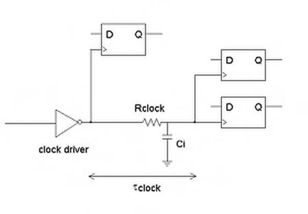 Solo per alcune linee particolarmente critiche può essere utile valutare l effetto della resistenza serie dell'interconnessione, considerando quest'ultima sempre come un elemento a parametri concentrati. Il ritardo dovuto alle resistenze serie delle interconnessioni è particolarmente importante per una sola interconnessione del nostro circuito, quella relativa alla linea di clock. Infatti, se abbiamo un sistema sequenziale, si avranno dei registri di memoria che catturano il dato al loro ingresso in corrispondenza dei fronti del segnale di clock. Il funzionamento del nostro circuito si basa sull'ipotesi che questi fronti del segnale di clock arrivino, nello stesso istante, a tutti registri del nostro circuito. Nel momento in cui ciò non accade, un registro può memorizzare un dato quando questo ancora non è valido, o quando questo sta ancora cambiando. Questo, ovviamente, non significa peggiorare le prestazioni del nostro sistema ma, piuttosto, che il sistema non funziona più. E' importante stabilire qual è il ritardo massimo che possiamo aspettarci sulla linea di clock e adottare le opportune contromisure. Abbiamo un ritardo sulla linea di clock proprio perché la linea di interconnessione non è ideale. Bisogna, allora, saper stimare il ritardo clock su questa linea di clock e, una volta stimato tale ritardo, garantire la funzionalità del nostro circuito.